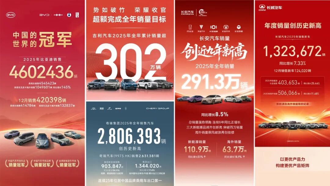比亚迪继续稳坐NO.1宝座,拿下三冠王:中国汽车市场车企销量冠军、中国汽车市场品牌销量冠军、全球新能源车市场销量冠军。值得关注的是,比亚迪2025年海外出口已超百万台,同比增长145%,直追“出口一哥”奇瑞。2025年,奇瑞出口销量为134.4万辆。