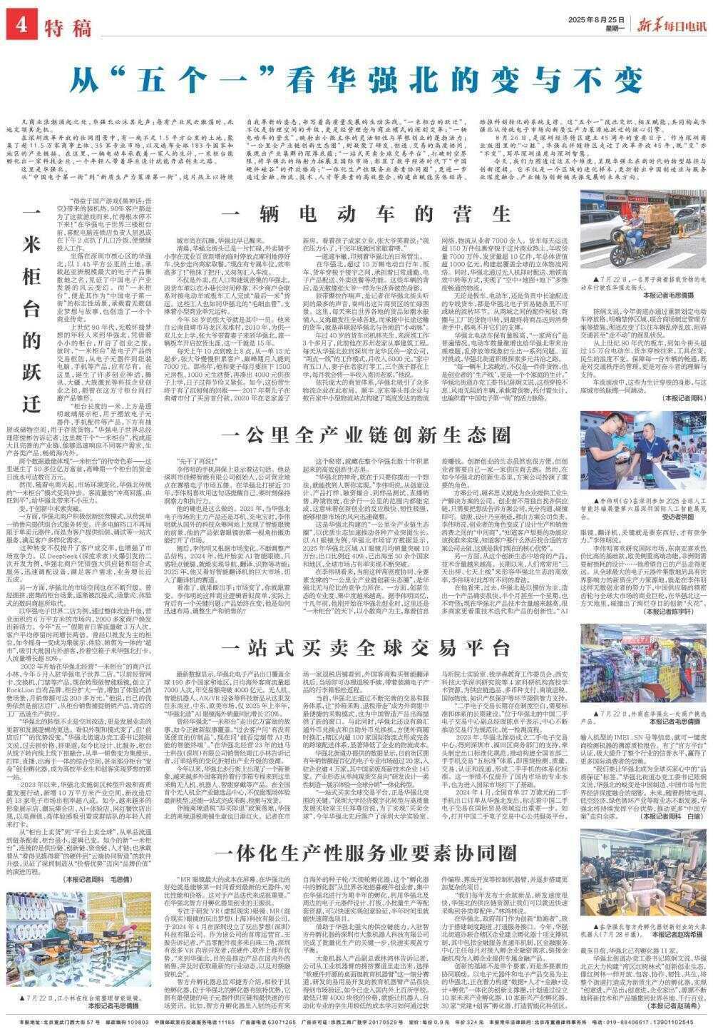 从“中国电子第一街”到“新质生产力策源第一街”,这片热土以持续自我革新的姿态,书写着高质量发展的生动实践。“一米柜台的跃迁”,不仅是物理空间的升级,更是经营理念与商业模式的深刻变革;“一辆电动车的营生”,映射出小微主体的灵活韧性与草根创业的蓬勃活力;“一公里全产业链创新生态圈”,则凝聚了研发、制造、交易的高度协同,展现出产业集群的深厚底蕴;“一站式买卖全球交易平台”,打破时空界限,将华强北的辐射力拓展至国际市场,彰显了数字经济时代下“中国硬件硅谷”的开放格局;“一体化生产性服务业要素协同圈”,更进一步通过金融、物流、技术、人才等要素的高效整合,构建出赋能实体经济、助推科创转化的系统支撑。这“五个一”彼此交织、相互赋能,共同构成华强北从传统电子市场向新质生产力策源地跃迁的核心引擎。
