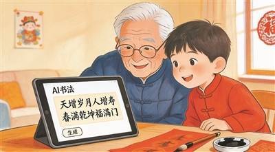忙活了十多分钟,最后连落款的小字、行距等细节,都按他写了40年春联的老习惯调得妥妥帖帖。爷爷注视着字,松了口气感慨:“我的字总算留下来了。”接着,他又提议道:“咱多做几款‘福’字,让这‘科技年味儿’也带给邻居们!”说干就干,用AI设计的几款“福”字,有的带着小巧祥云纹,有的嵌着爷孙俩的名字,打印出来红彤彤得十分亮眼。我和爷爷将“福”字码好,挨家挨户送去。“真好的字!”邻居们不约而同地赞叹,这带着科技的年味儿是一份心意与真诚的祝愿。