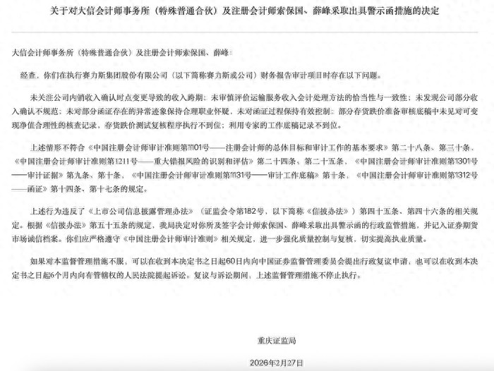 重庆证监局披露行政监管措施决定书显示,大信会计师事务所(特殊普通合伙)因在执行赛力斯集团股份有限公司年度财务报表审计项目过程中存在执业程序不到位情形,被采取出具警示函措施,并记入证券期货市场诚信档案。