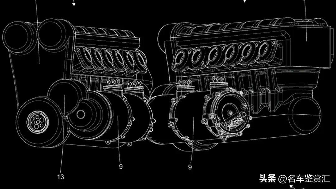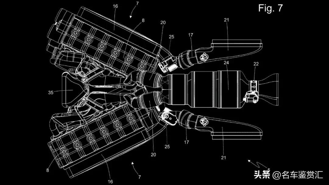 然而,到了第三项专利,法拉利的工程师们脑洞大开了。它展示了两台以V型布局排列的直列六缸发动机。但如果你像看其他V型发动机那样顺着曲轴方向看,它又不是一个V型,只有当你从上方俯视时,这两台发动机才呈V型。它们仅通过一根排气管连接在一起。