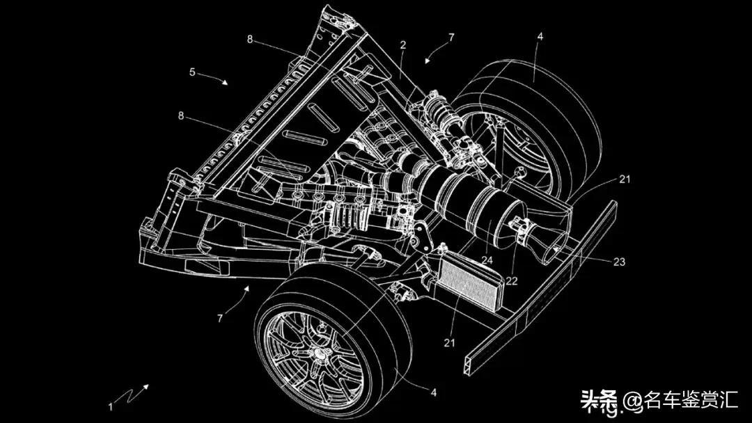 根据专利的描述,理想的V型夹角将在20到30度之间。法拉利展示在开口端可以布置电池组或油箱,这种情况下夹角最多可达45度。两台发动机都位于驾驶员和后轮之间,因此这将是一款中置发动机的增程电动车。